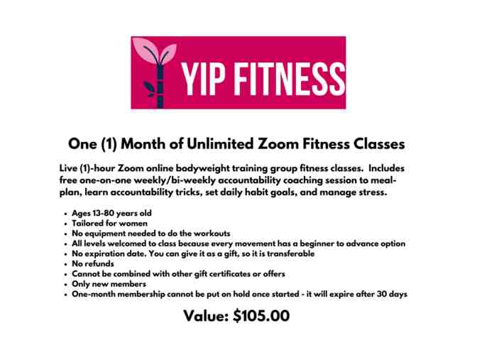 One (1) Month of Unlimited Zoom Fitness Classes by YIP Fitness