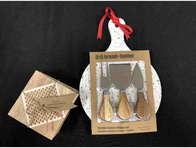 Entertaining made simple! Display all your favorite cheeses on this beautiful Marble Cheese Board with 4 Piece Cheese Slicing/Cutting Set and set of 4 Handcrafted Coasters.