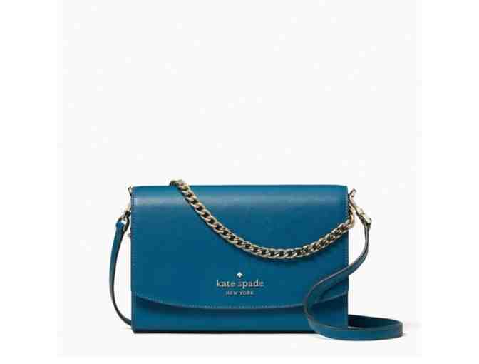 Kate Spade New York from the Carson Collection. This crossover body bag is saffiano leather with a metal pinmount logo. An exterior slip pocket back, magnetic snap button flap closure, two way Spade jacquard lining and an interior wall slip pocket.