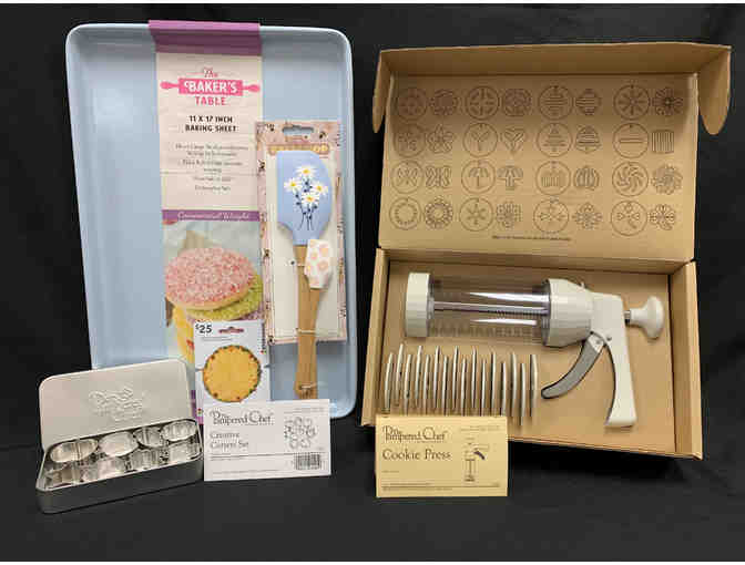 You'll be the envy of every baker when your cookies are the finest in the land! Your Pampered Chef Cookie Press lets you create the most magnificent of cookie masterpieces, and everyone will want a sampling! In addition, this package includes a new 11X17 baking sheet from The Bakers Table, a Double Spatula Set, a Pampered Chef Creative Cutters Set, and a $25 Gift Card to Stop and Shop! The perfect package to delight any baker.