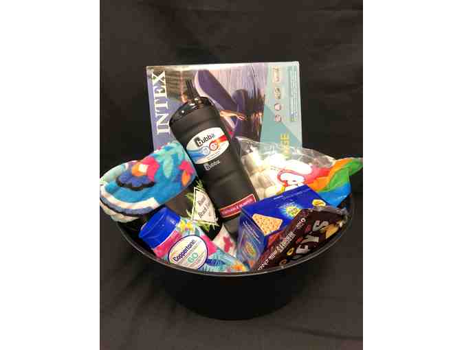 This basket contains: Intex Floating Recliner 65", Beach Towel, 24oz Insulated Tumbler, Smores Essentials, Sunscreen