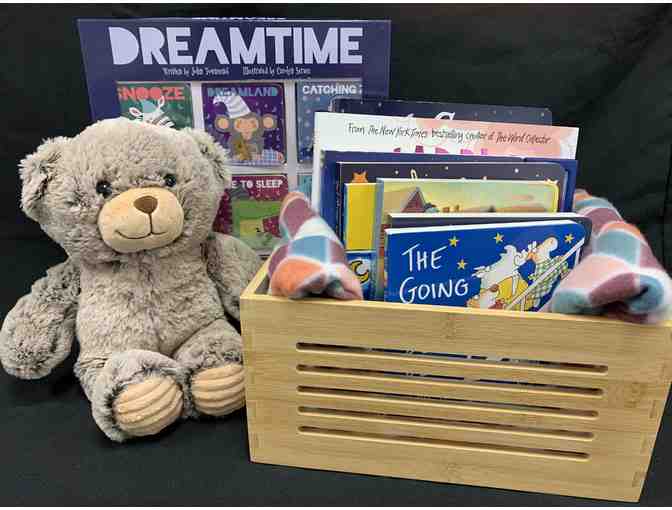 This basket includes: "Teddy Bear, Dreamtime" by John Townsend, "The Going to Bed Book" by Sandra Boynton, "Good Night Red Sox Fenway Park," "Snowmen at Night" by Caralyn Buehner, "Time for Bed Pete, the Kitty" (Touch and Feel Book), "Owl Always Love You" by Patricia Hegarty, "Goodnight, Goodnight Construction Site" by Sherri Duskey Rinker and Tom Lichtenheld, "Happy Dreamer" by Peter H. Reynolds, and "A Cozy Good Night" by Linda Ashman and Chuck Groenink.