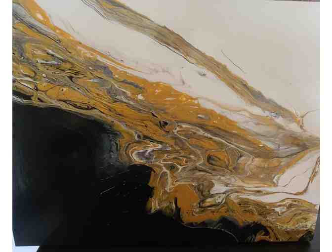 Display this 18"x24" original Marcia Wyatt painting for all to see. This beautiful white, gold, and black swirl painting is on a 18"x24" canvas. Hanging wire attached for ease of display.