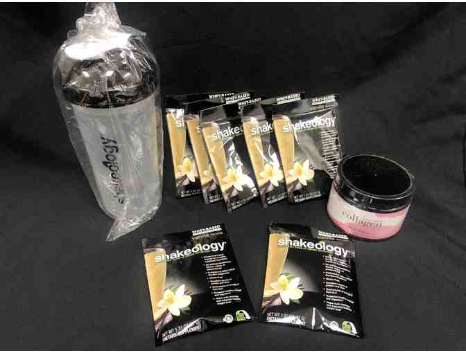 This basket includes: Shake Cup, a week of Shakeology Vanilla Flavored Whey-Based Superfood Nutrition Shake, a month of Beach Body Collagen Boost.