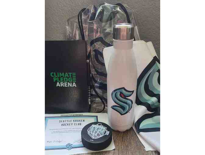 With this fan starter-pack, you'll be ready to cheer on the Kraken in style! This package includes one Seattle Kraken clear cinch backpack filled with a reusable titanium water bottle, Climate Pledge Arena notebook, rally towel, and inaugural-season puck signed by #60, Chris Driedger!