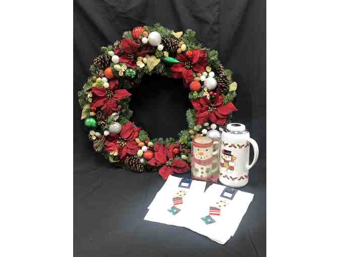 Your christmas spirit will shine through with this coffee butler thermos and mug set. Matching kitchen towels and a beautiful wreath will have your home perfectly decorated for your holiday display.