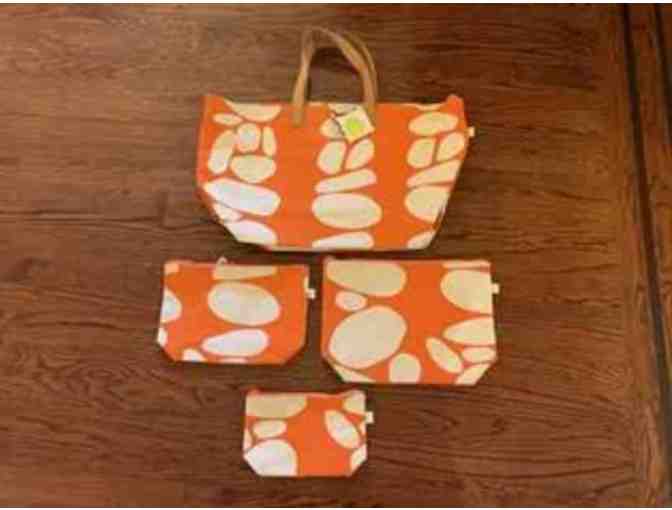 This See Design travel bag set includes an overnighter tote bag and two matching cosmetic pouches. The perfect size for a night or weekend away, these bags are 100% cotton canvas with sturdy construction to enable you to carry all kinds of items. Their unique style and design can be enjoyed for a long time! All of their canvas is heavy weight and patterns are printed on both sides. For added protection, the bags have a water repellent coating.