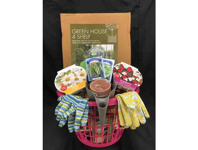 This 4 shelf green house, distributed by Nantucket Distributing, measures 19.25" long x 27" deep x 63" high. Also included, a filled to the brim gardening basket with seeds (flower and veggie), starter kits, planting pots, gardening gloves, gardening tools and watering can.