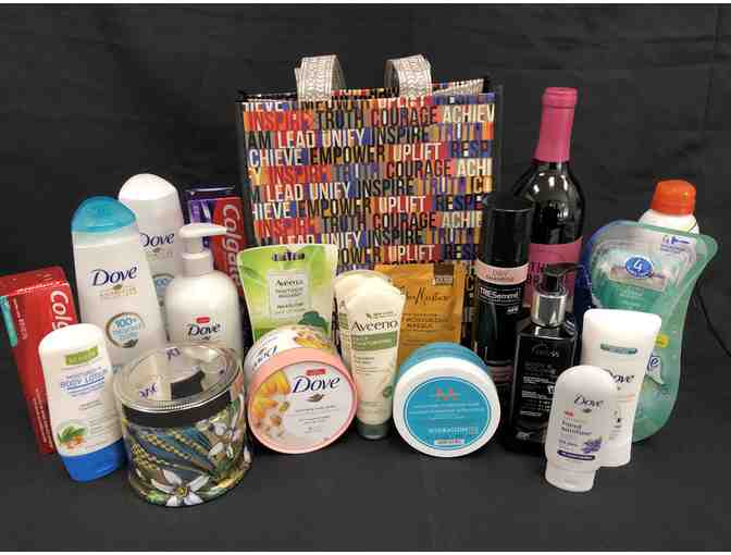 This package includes: Dove beauty products, Aveeno Lotion and Facial Mask, Shea Moisture Mask, Tresemee Dry Shampoo, Moroccoan Oil Weightless Hydrating Mask for hair, Truss Body and Volume for Hair, Gillette Razors, Colgate Toothpast, Partylite Candle (Cucumber Clementine) and Bottle of Tiny Umbrellas Red Blend Wine.