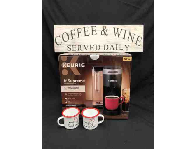 Start your day off right with this Coffee Lovers package! Featuring the Keurig K Supreme Single Serve Brewer, choose your favorite mug and just press and pour. The rustic farmhouse sign, "Coffee and Wine Served Daily," will highlight your coffee station, and the additional 2 mugs will be perfect for brewing that hot cup on demand. Also included, a $40 gift certificate to Create & Escape in Peabody, where you can create your own, personalized coffee flight board (4 cups). Customize with your family initial, name or saying, and you'll be serving your guests their coffee in style!