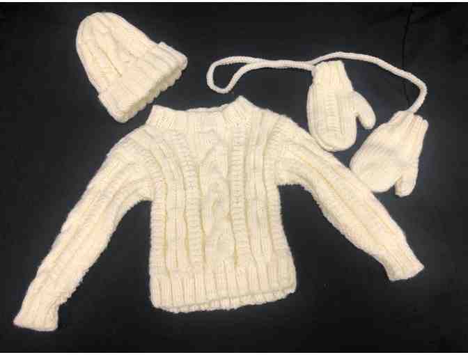 Snuggly and warm your little one will be during the winter wearing this hand knit sweater, hat and mittens set.