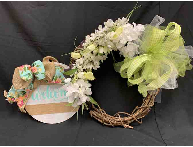 Decorate your door and home with this beautiful spring grapevine wreath and welcome sign. Wreath is adorned with spring flowers, green gingham check ribbon and tulle. Welcome sign is a wonderful greeting for all of your guests! Burlap and floral ribbon with turquoise script lets you know Spring is in the air!