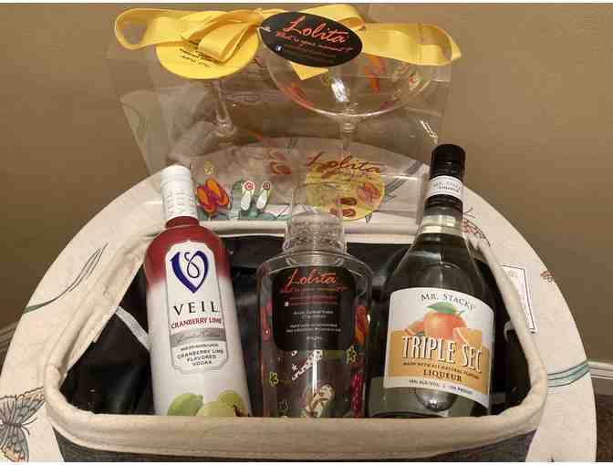 This basket contains a Lolita shaker and 2 plastic Flip flop martini glasses (set), Veil Cranberry Lime vodka and Mr. Stacks Triple Sec, miscellaneous garnish and sugar.