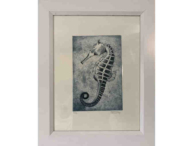This beautiful, one-of-a-kind, sea horse etching was hand crafted by our very own art teacher, Camryn Connolly! Matted and framed, it measures 12" x 15".