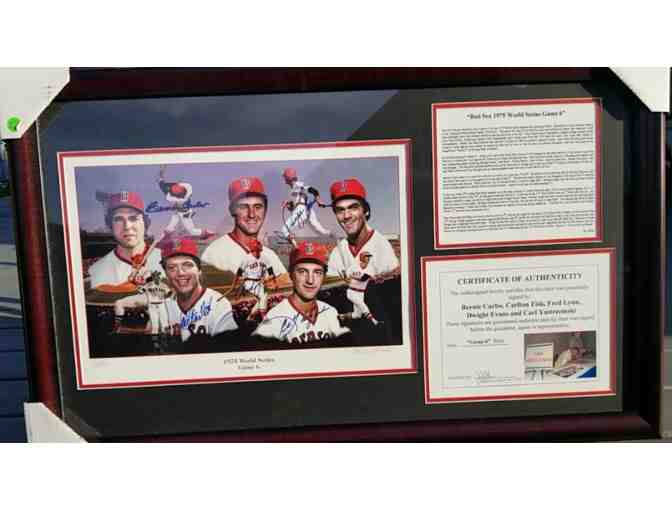 UP FOR AUCTION IS A BEAUTIFULLY AUTOGRAPHED FRAMED MEMORABILIA OF THE BOSTON RED SOX 1975 WORLD SERIES GAME 6 HEROES. AUTOGRAPHED BY CARL YAZSTREMSKI, CARLTON FISK, DWIGHT EVANS, BERNIE CARBO, AND FRED LYNN. COMES WITH CERTIFICATE OF AUTHENTICITY.