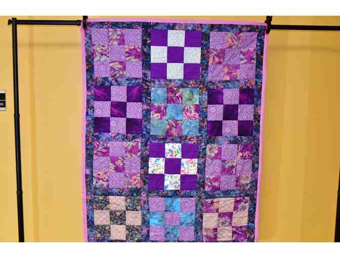 Nine Patch Quilt made with batik cotton fabrics and one block displaying beautiful flowers. The fabrics colors of pink and purple are further displayed in the backing of colorful dots with a pink binding. This quilt was made with cotton batting.