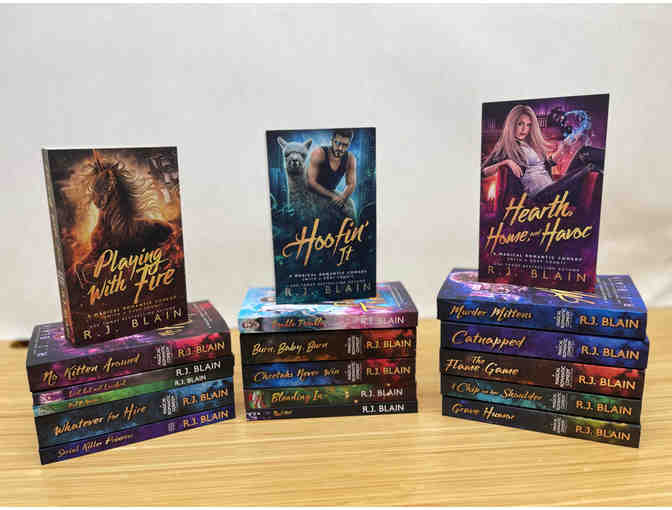This book box contains the first 18 of R.J. Blain's Magical Romantic Comedy series up to Catnapped (book #18). All books are paperbacks and autographed. Five of the books also have print cover art that can't be acquired elsewhere.