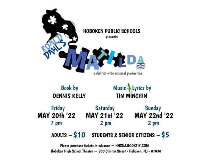 The hottest tickets in town can be yours! Get ready to be dazzled and thrilled by the District Wide Musical Production of Matilda on Friday, May 20th at 7pm at Hoboken High School. The winner has the opportunity to take a photo on set after the show with Hoboken's One and Only, Queen of Hoboken Theater, Fine & Performing Arts Leader, Danielle Miller. Sit back, relax, and enjoy the show.