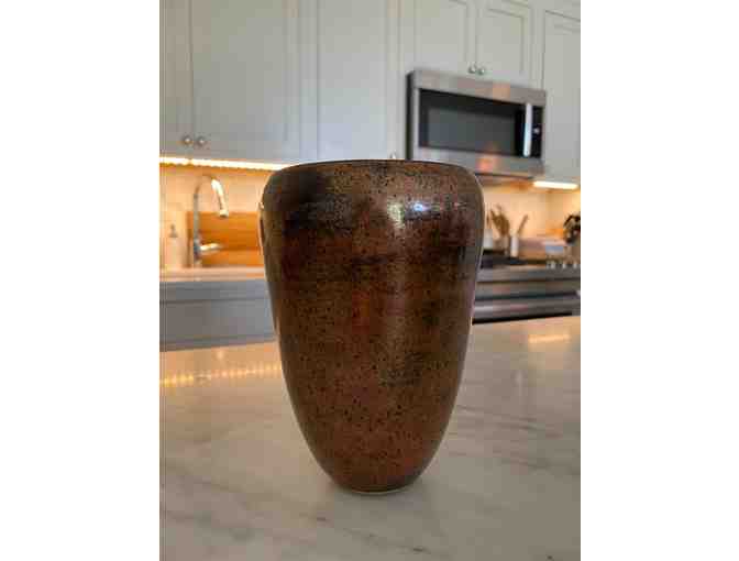 One of a kind handmade ceramic vase with a copper glaze made by an Open House student's Grandpa!