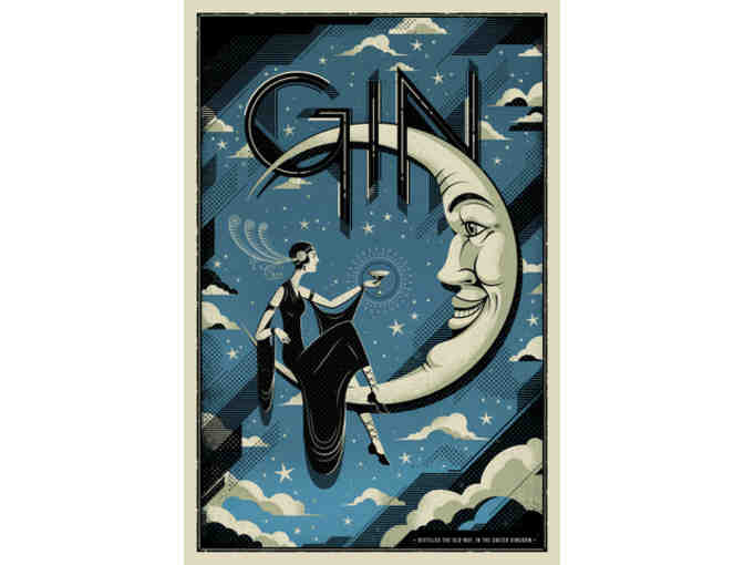 "Roaring-twenties" style print in homage to Gin. Illustrated by Graham Irwin, Screen printed in 3 colors on French craft tone pencil wrap 100lb paper, size 18x24"