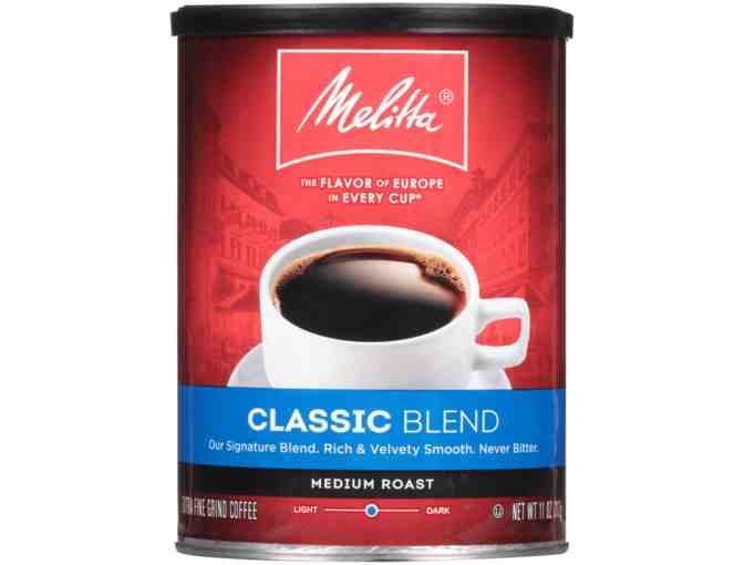 A gourmet coffee gift box with Melitta's Classic Blend Medium Roast, a hand frother, coffee filters, a pour-over coffee maker, and sweetner.