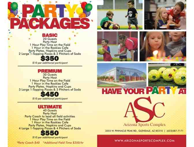 Certificate for a party for 20 guests at the Arizona Sports Complex (Glendale, AZ). Includes one party host, one hour of play time on the field, one hour in the Party Room, party plates, napkins, cups, two large one-topping pizzas, and two pitchers of soda.