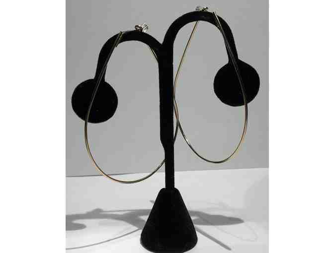 A pair of extra-large 14K gold fill Phoebe Teardrop wire hoop earrings and a single 14K gold fill Lillith Bold wire ear cuff by Sarah Briggs.