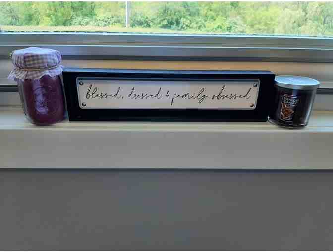 Keep your house looking and smelling fresh with a 7oz Candied Pecans scented Yankee Candle, a Purple Mason Jar candle, and "Blessed, dressed, & family obsessed" Belle Maison box sign. Sign measures 4"H x 16"W x 1.25"D.