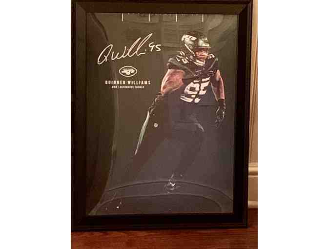 Cheer for the New York Jets with this framed replica lithograph autographed poster featuring defensive tackle Quinnen Williams. 18” x 24”. This is affordable wall art to hang in a dorm, bedroom, office, or anywhere a blank wall isn't welcome.