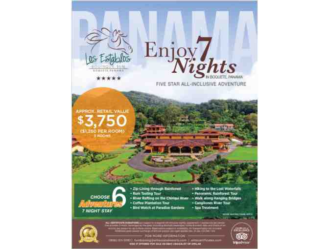 Five Star All-Inclusive Adventure. 7 nights of Luxurious Scenic accomomdations for up to 3 rooms double occupancy at Los Establos Boutique Inn, Panama. This is an award-winning 5-star boutique inn boasting magnificent gardens, adventure walks, and breathtaking views. Choose 6 adventures: