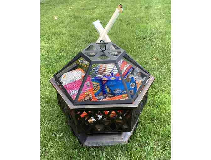 Just in time for summer - host your summer parties around this beautiful steel, wood-burning fire pit! This hexagon shaped firepit is approximately 27" L x 17" W x 16"H and includes an easy to lift mesh spark guard top. The firepit is filled with Resees Peanut Butter Cups, Hersey Chocolate Bars, Big Bite cake-filled marshmallows, regular marshmallows, giant marshmallows, Honey Maid graham crackers, a Zap Guard solar light and bug zapper, and 30" wood camp skewers - everything you need for your best backyard smores party ever!