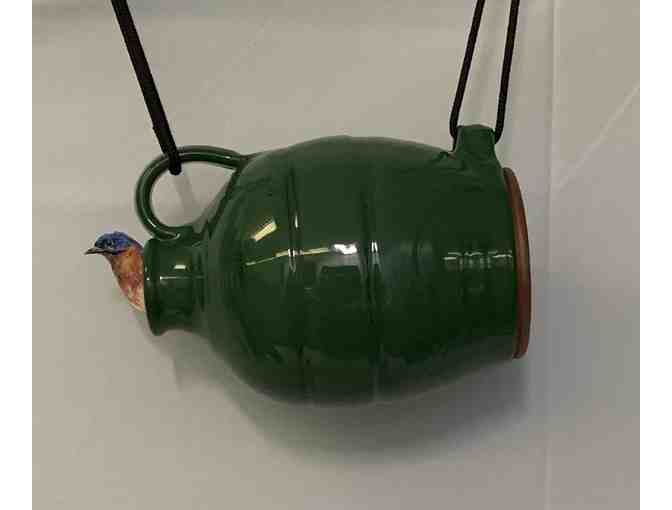 A Village-made pottery birdhouse in green glaze, thrown on a pottery wheel in Old Sturbridge Village.
