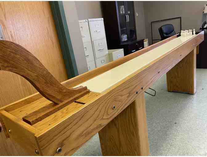 This unique, handmade, solid-oak game will not only keep your friends and family entertained for hours but is sure to be a conversation piece for all your guests. You have the option to set up for a game of bowling or shuffleboard.