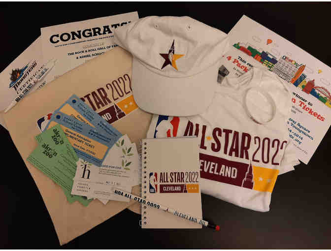 Cavs Pack includes Cleveland Cavalier All-Star branded t-shirt, tote bag, hat, wrist band, pen, pencil and a small spiral note pad.