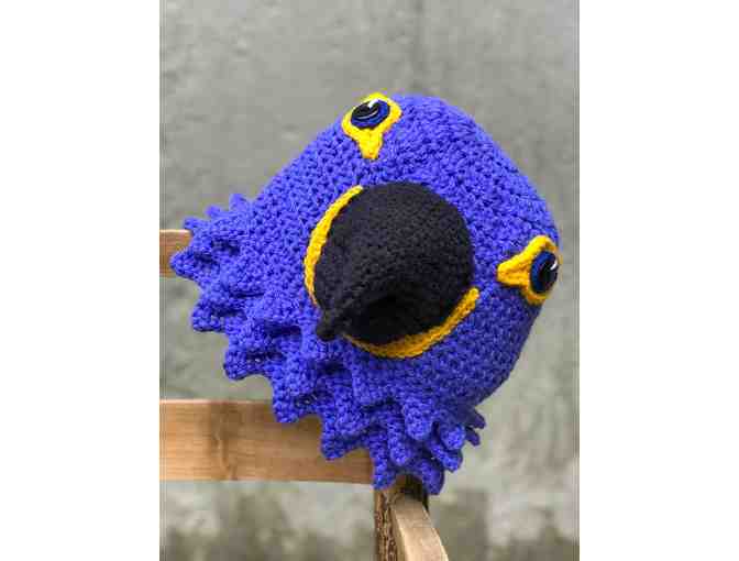 Show off your love for the Zoo and our own hyacinth macaws, Amy and Angel, with a winning bid on this fabulous hand-crocheted hat designed and created by a local artist, Mary Gauvin!