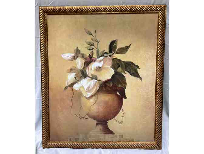 A large, floral still life in a decorative frame. This painting measures 52" H x 45" W.