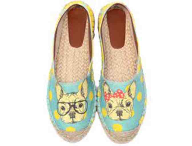 Showcase your bold personality with this slip-on espadrille that boasts a playfully vibrant French bull dog motif for an eye-catching finish.