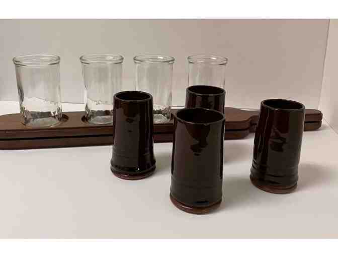 Hand-crafted flight board and redware tasting glasses
