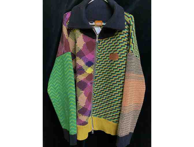 This long-sleeved zip-up cardigan is men's size 2XL, but it's colorful pattern can be worn by anyone!