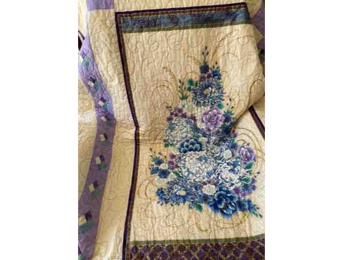 I can't find words to describe the beauty of this quilt. Purple and blue flowers are set off by a beautiful quilt pattern on both sides. 68X46 is the perfect size to snuggle up with your furry friend.