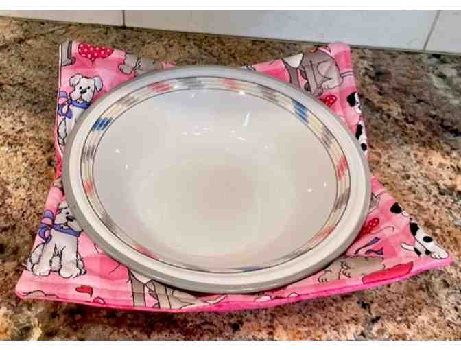Your kitchen can be a reflection of your favorite thing....Puppies! This adorable microwave bowl cozy will keep your hands protected when removing food from the microwave. This cozy is pink on one side and has cartoon dogs on the reverse.