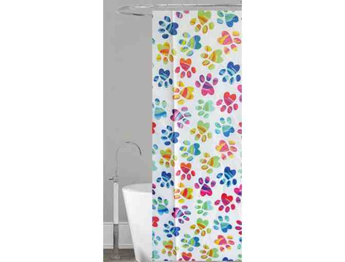 Redecorate your bathroom with this blue and pink multicolor pawsome paw print shower curtain. Includes metal roller hooks to hang the curtain.