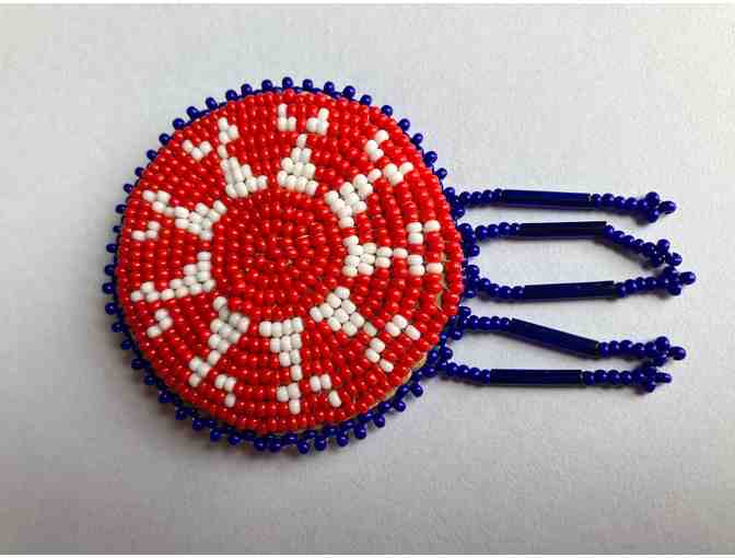 Cochiti 11” lullaby drum, by Gabe Yellowbird Trujillo;Oglala Lakota brooch rep Nation’s 9 districts