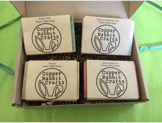 Gift box of four soaps: Rose Geranium Goats Milk Soap Bar, Fresh Pine Goats Milk Soap Bar, Honey Lavender Oat Goats Milk Soap Bar, and a Citrus Goats Milk Soap Bar