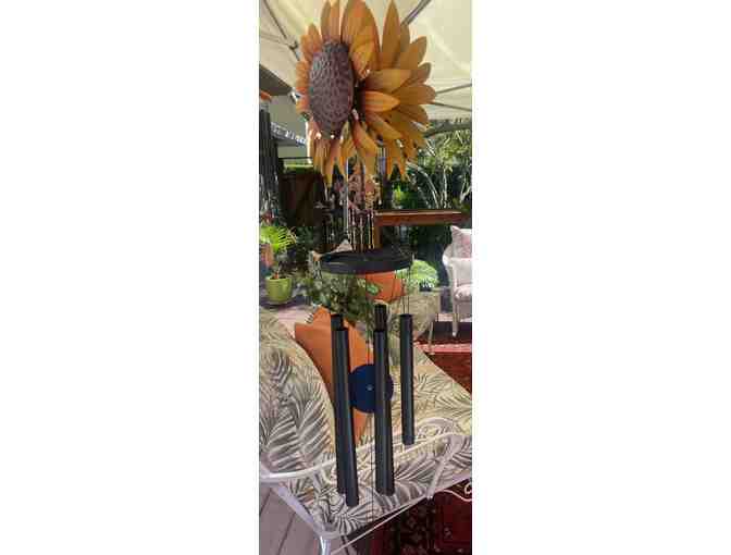 These melodeous sunflower wind chimes are three feet long with an easy-attach hook. Made of metal, they have a metalic twang when the wind blows.