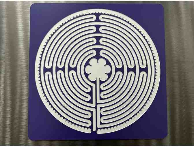 This labyrinth is created in 1/16 inch acrylic and is a vibrant purple and bright white engraved labyrinth path.