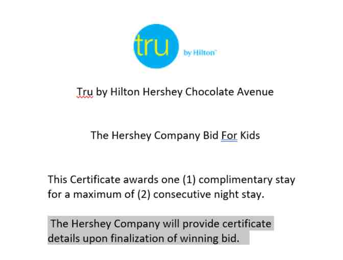 The Hershey Company will provide certificate details upon finalization of winning bid.
