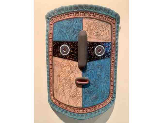 “Shaman” Archaic Mask Earthenware Clay with crystalline glaze, matte slips, decorated with drawn and stamped images 19” h x 13” w x 3 1/2” d