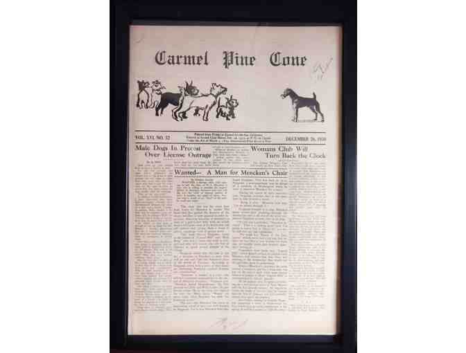 The Carmel Pine Cone Newspaper Dec 26, 1930, framed in an easily accessible 13 x 19 black frame, so the newspaper can be removed and read about Male Dogs in Protest Over License Outrage! Oh, the humanity!