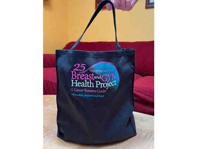 Attractive and roomy 17" by 17 1/2" tote bag in the colors that represent Breast and GYN. The black canvas background makes the bright pink, teal and white print and design stand out. Show off your support, of the Breast and GYN Health Project's 25 years of service to the community, while you fill your tote with all your goodies. Give it as a great gift or buy it for yourself while supporting the BGHP. Get yours now!